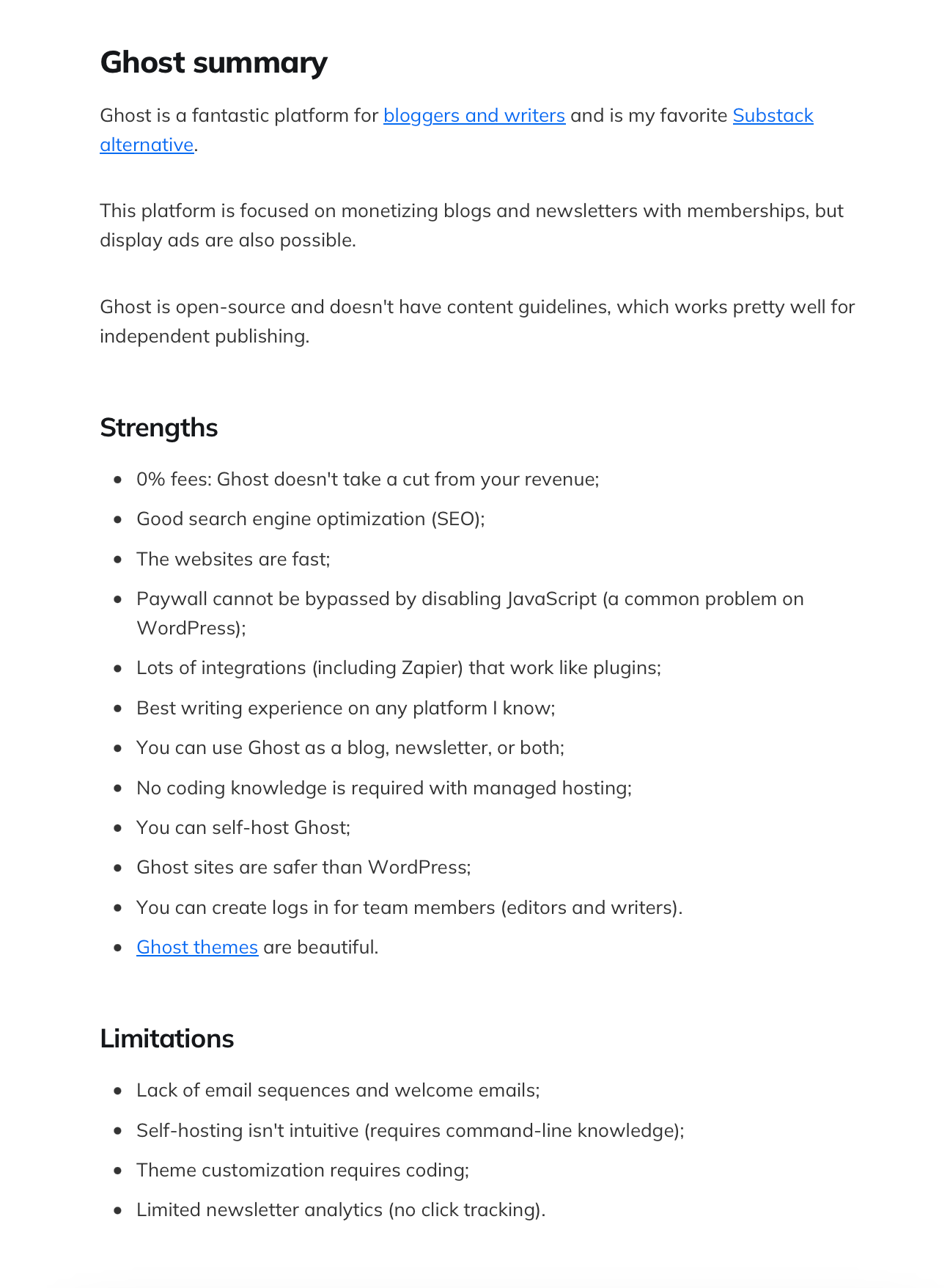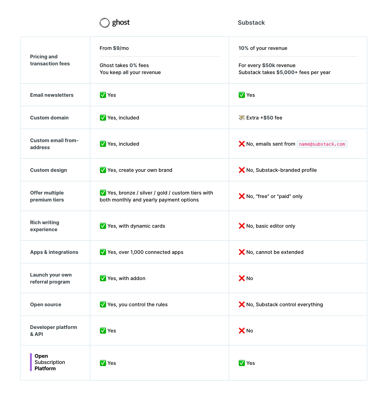 And I found this comparison: Substack vs Beehiiv vs Ghost vs Revue vs Paragraph.xyz from Poly Innovator. I would go here for a deeper comparison.