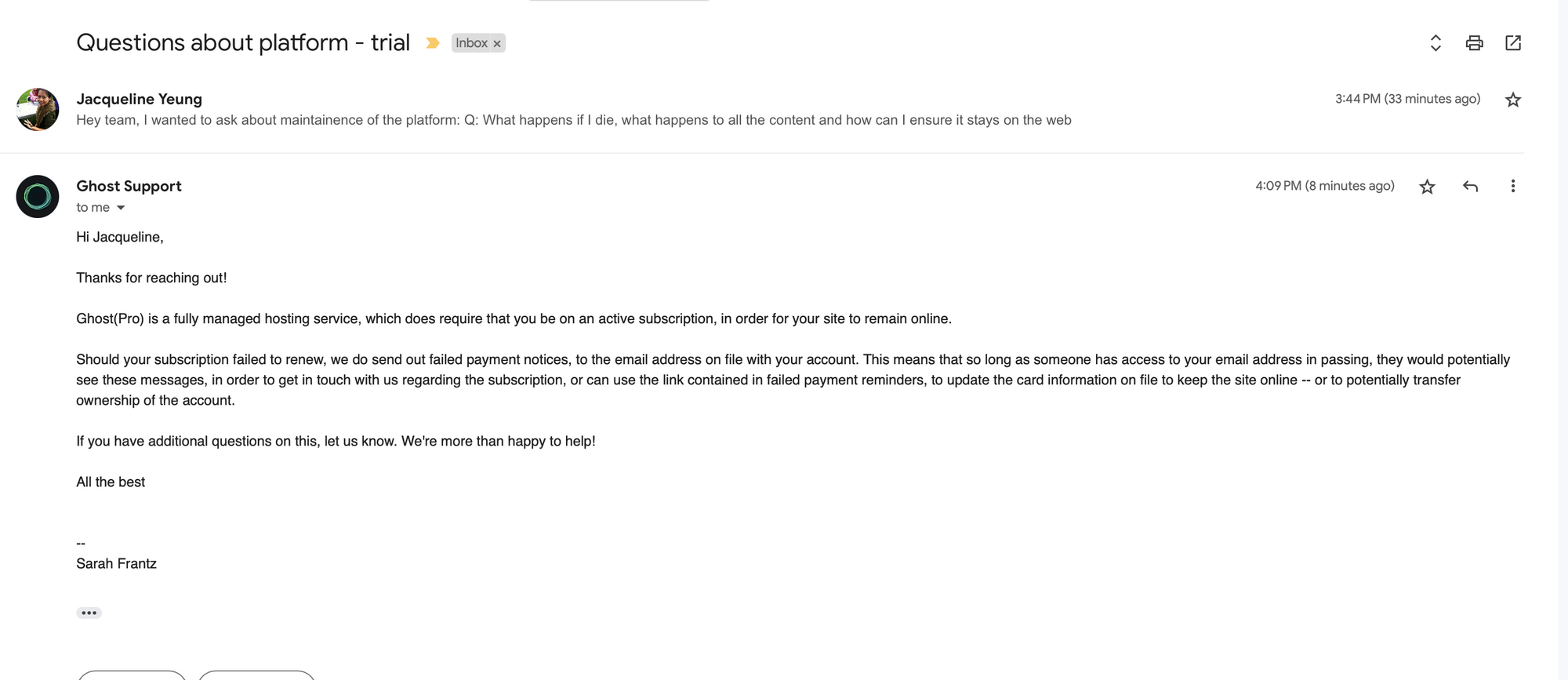 However, I still had a question, what happens if I die? How will I keep my content up online? Will everything just be gone if I'm dead? :(