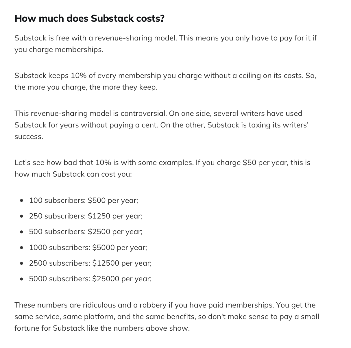 Substack - free or $208.33 per month(at 10% of every membership, each $50/yr)