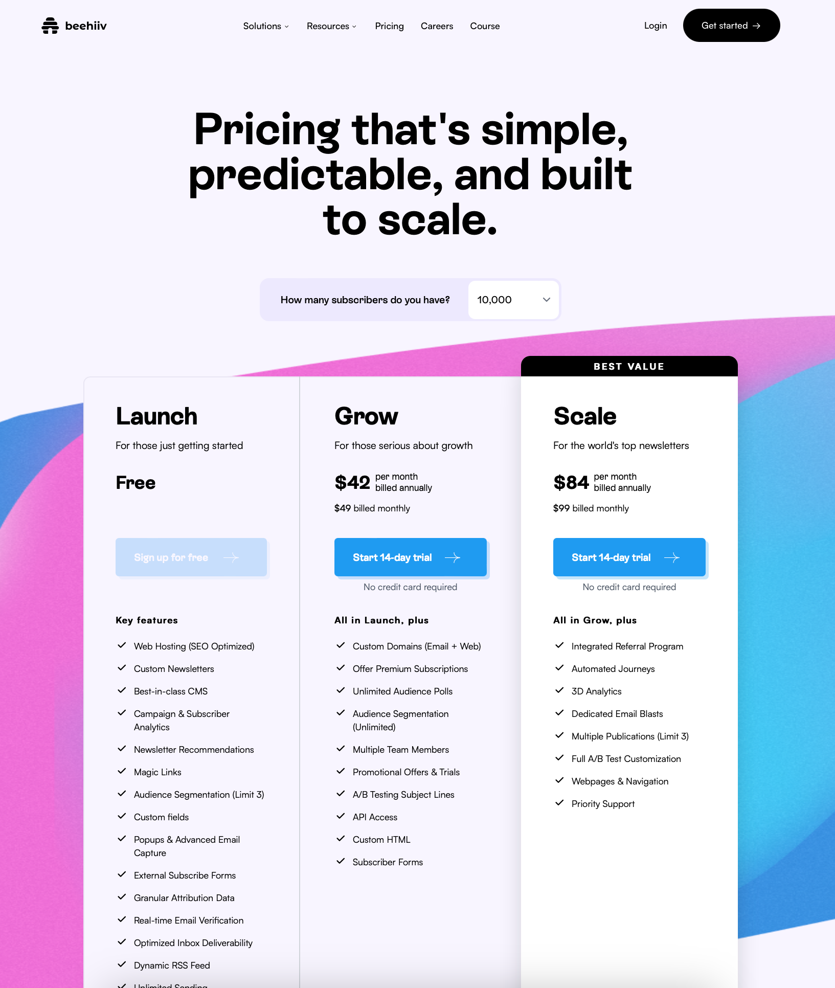 Beehiiv - $42/month (anything less than 10k, stays at $42/month)